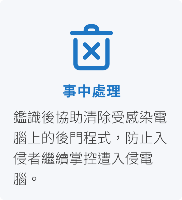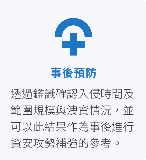 資安事件處理服務IR Solution因為攻擊目的不同,APT 攻擊相較其他資安入侵攻擊更難被察覺,企業從 APT 攻擊入侵成功至察覺有異平均長達 200 天以上,發生原因與入侵管道相當複雜。當企業確認或懷疑內部遭到 APT 攻擊時,可透過 IR Solution 資安事件處理服務,由專業顧問介入實行鑑識與清理並強化保護措施,降低再度受駭的風險。