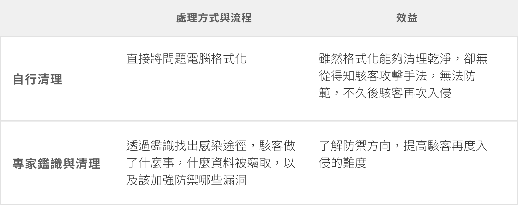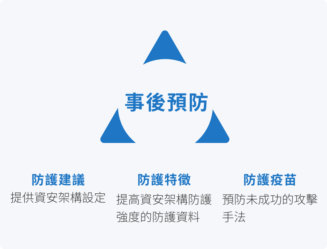 面對進階持續性滲透攻擊,需要長期持續的資安照護,遭到鎖定的目標,經過清理後仍可能再次遭到入侵。岢成資訊提供長期的資安照護服務,在訂閱此服務後,岢在服務合約期間收到防護建議,特徵與疫苗,提高入侵者再次嘗試侵入的門檻。