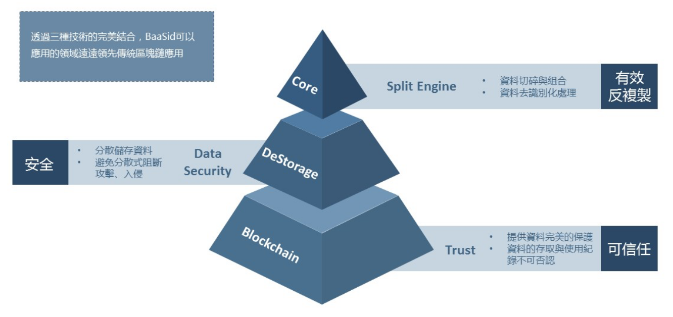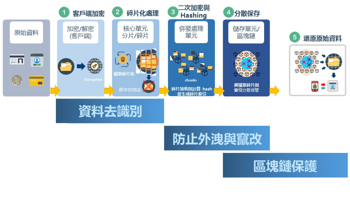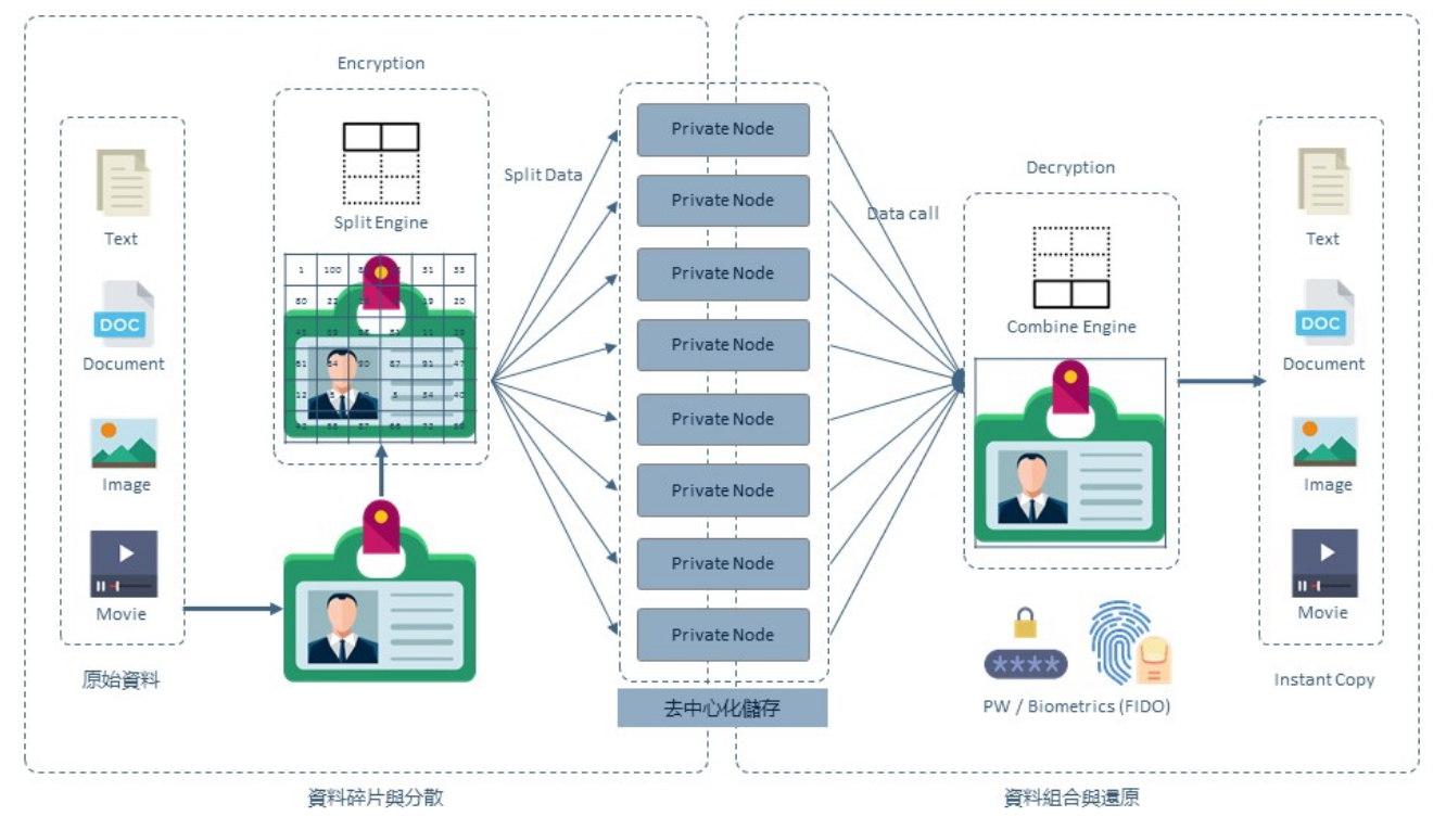 獨家的技術引擎可以將原始資料有效的進行碎片化、加密資料碎片並分散儲存於儲存裝置與區塊鏈上,利用區塊鏈的特性保護資料的安全;於資料使用時快速組合、解密並還原為原始資料。資料經過核心引擎處理後,可以提供完全的去識別效果,任何人都無法窺視資料內容;同時資料碎片以分散狀態進行保存,可以有效避免外部不法入侵成功後,導致原始資料外洩以及資料竄改的風險。
